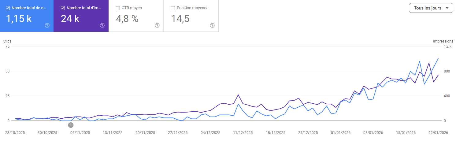 Mes optimisations couvrent l’ensemble des critères essentiels à un bon positionnement : vitesse de chargement, balises HTML, arborescence, maillage interne, et des contenus rédigés pour performer sur les mots-clés les plus recherchés dans votre secteur.